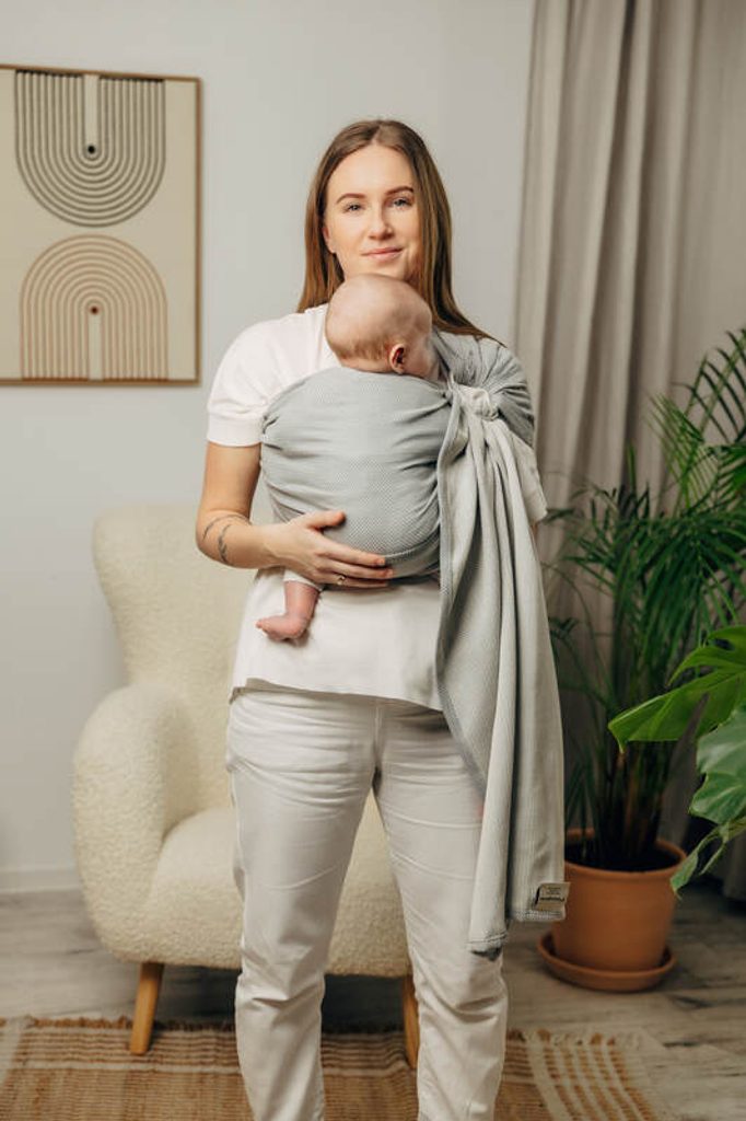 Ring Sling - šátek s kroužky je jednoduchý a velmi rychlý způsob, jak nosit miminko na jednom boku. Nemusíte nic vázat, jednoduše ring sling položíte na jedno rameno, do látky na vašem boku usadíte miminko a už jen jednoduše a snadno dotáhnete látku v kroužcích. Ring sling využijí jen výjimeční nosiči, ale poslouží jako jednoduché poponášecí řešení zkušeným.