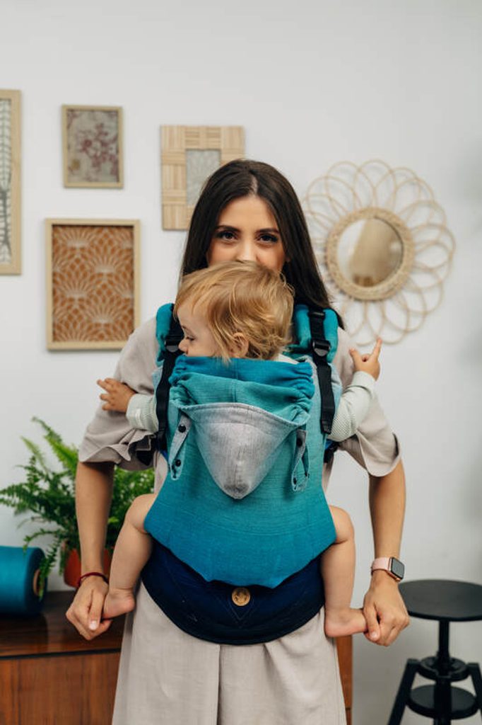 Nosítko je určeno pro nošení na břiše, později můžete větší miminko přesunout dozadu a nosit ho na vašich zádech.