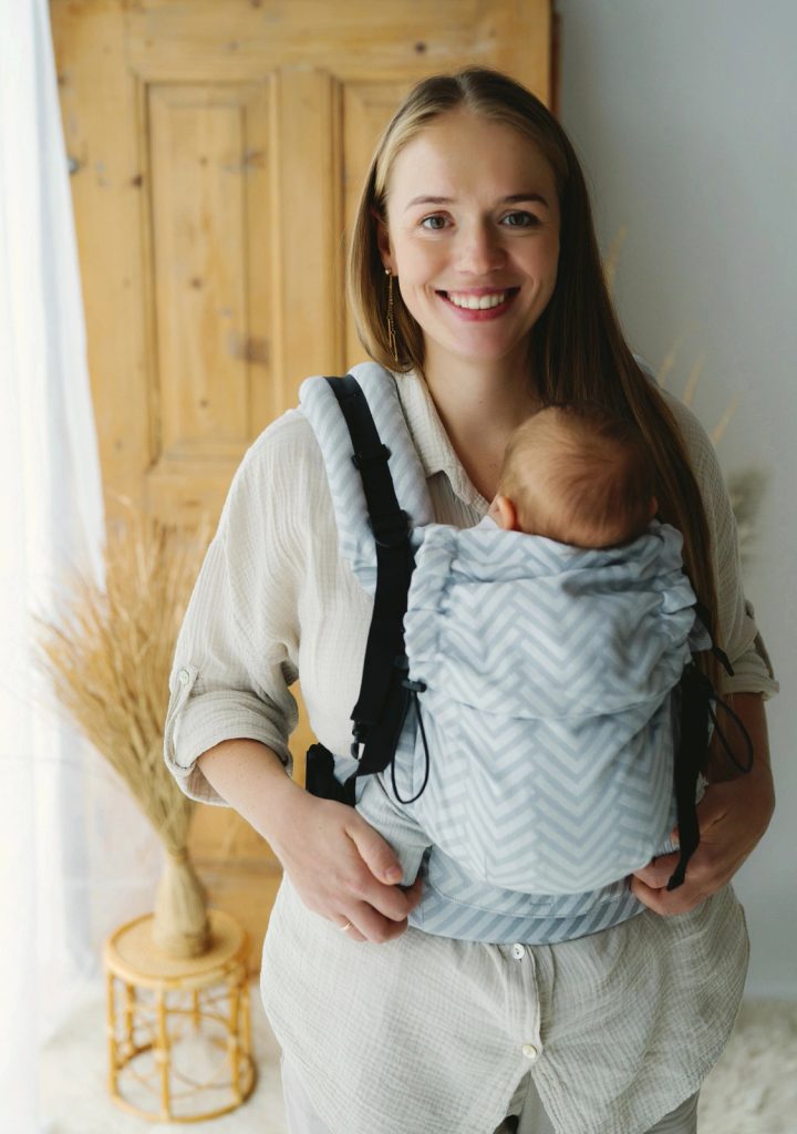 Stačí zapnout bederní pás, usadit dítě, přetáhnout panel, nasadit ramenní popruhy, utáhnout – a hotovo! Máte volné ruce a dítě je bezpečně a pohodlně přitulené k vám.